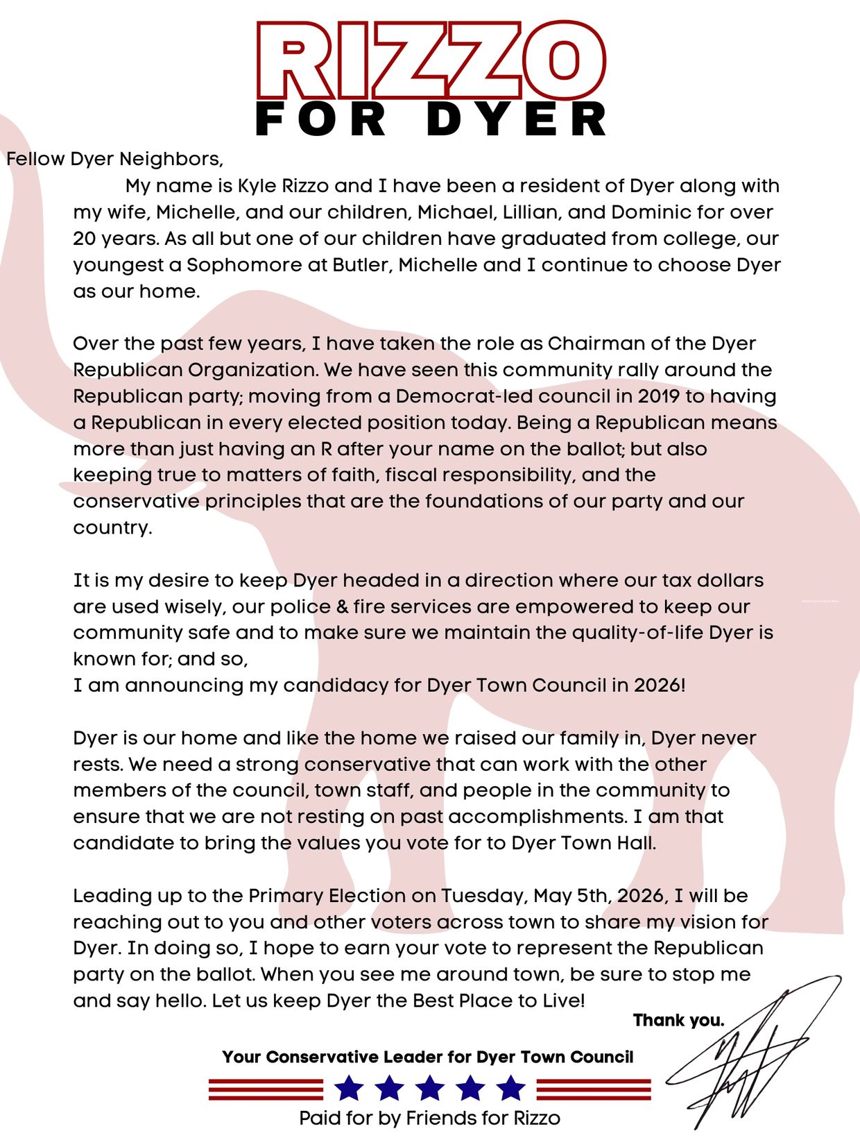Check back often as we expand this website to include notes on my campaign platform, maps of Dyer & our polling locations, and ways to donate to the campaign.